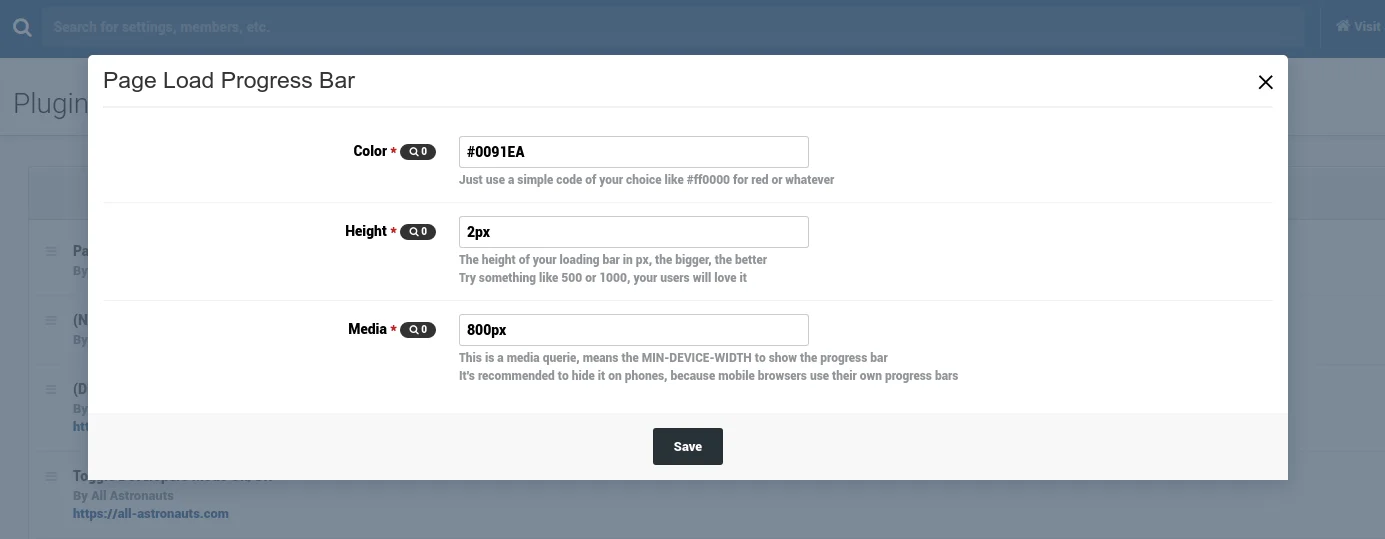 Simples kleines Plugin, das oben am Rand der Seite einen Ladebalken generiert (siehe Screenshot). Dazu gibts noch ein paar Settings, wie Farbe und Höhe des Balkens, sowie die Displaygrösse ab der das angezeigt werden soll.