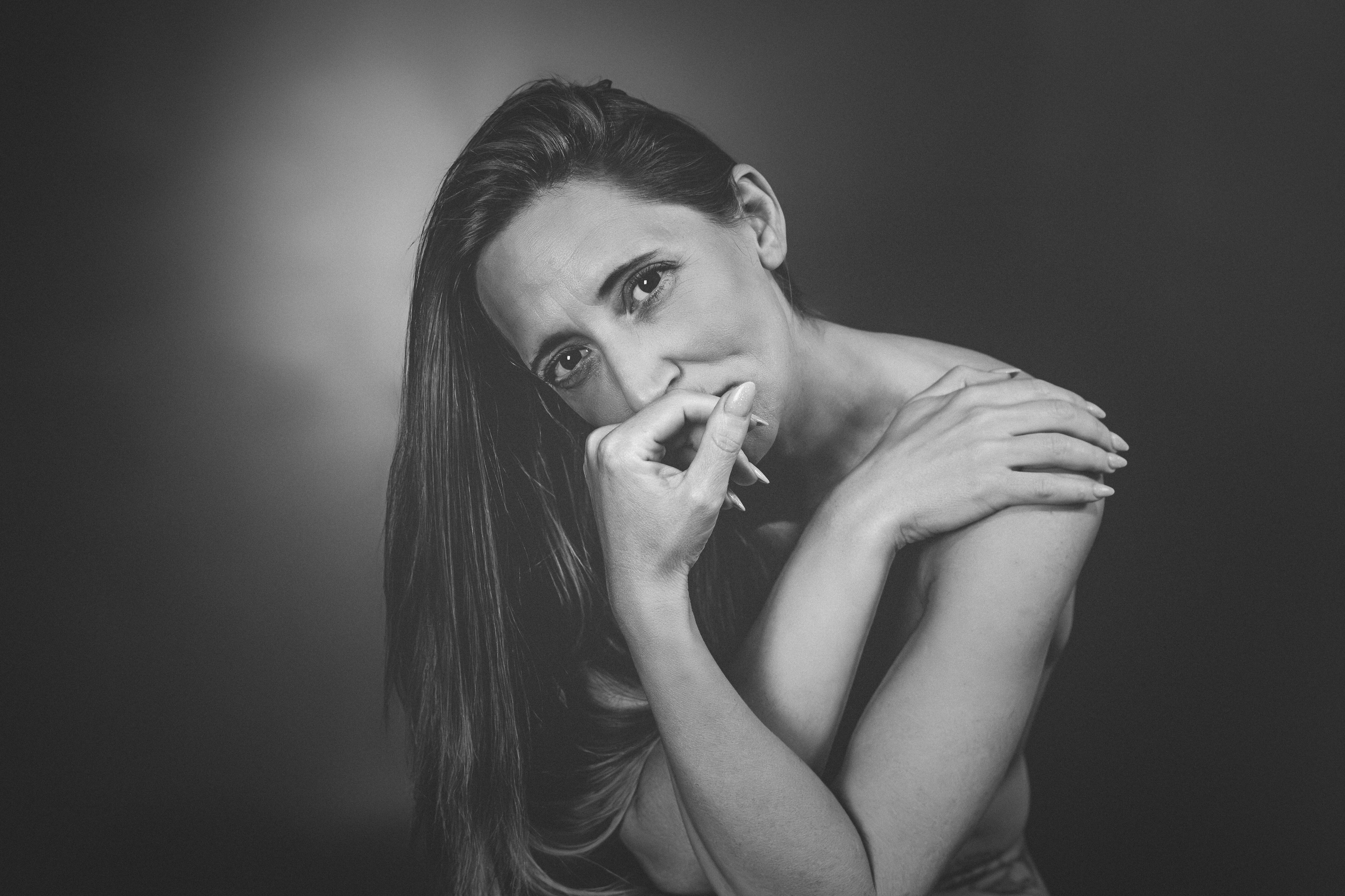 An intimate black-and-white portrait that reveals as much as it conceals. The gaze - partly hidden yet piercing - invites the viewer to pause and reflect. Light and shadow sculpt the face and body, emphasizing vulnerability as much as inner strength.